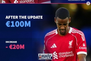 伊萨克(利物浦):1.2亿→1亿