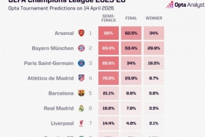 OPTA对拜仁、阿森纳等队的晋级概率进行了预测,拜仁晋级概率83.4%,阿森纳晋级概率88%,也就是说皇马的晋级概率仅为16.6%,葡萄牙体育则低至12%。