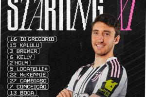 尤文首发:16-迪格雷戈里奥、15-卡卢卢、3-布雷默、6-凯利、2-霍尔姆、5-洛卡特利、22-麦肯尼、27-坎比亚索、7-孔塞桑、13-博加、30-戴维