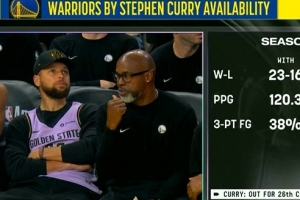 勇士主场迎战马刺,镜头给到库里时,转播方给出了本赛季有无库里勇士战绩对比。