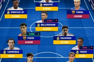 前锋:维尼修斯(皇马,1.5亿欧)、姆巴佩(皇马,2亿欧)、亚马尔(巴萨,2亿欧 )